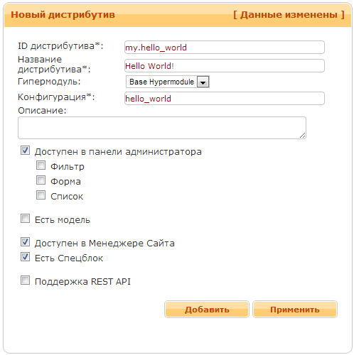 ЗадачаСоздать модуль "Hello World", который будет выводить текстовую строку "Hello World!". Текст можно изменить в настройках модуля. Модуль должен работать как в панели управления, так и на публичной части сайта. На публичной части сайта модуль должен иметь возможность работать как в режиме модуля, так и в режиме спецблока. Суть решенияПоскольку модуль обеспечивает простейший функционал и не требует наличия модели данных, для его реализации подойдет базовый гипермодуль ami_clean. С помощью генератора решений будет создана конфигурация базового гипермодуля будет называться hello_world. Для вывода текстовой строки будет использована пользовательская компонента типа "informer". Создание основы модуляИспользуя расширение Генератор решений, создадим дистрибутив со следующими параметрами: