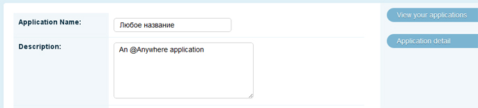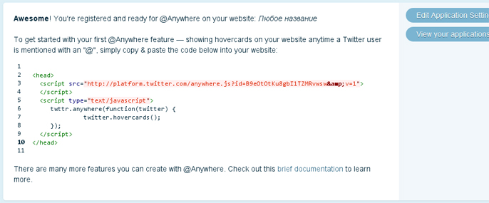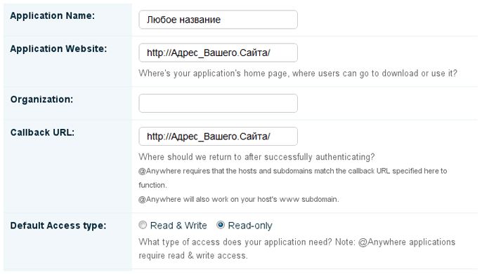 Требуются два параметра: app_id и consumer_secret. На странице https://dev.twitter.com/anywhere/apps/new заполните форму регистрации сайта и нажимаете кнопку Register Application.