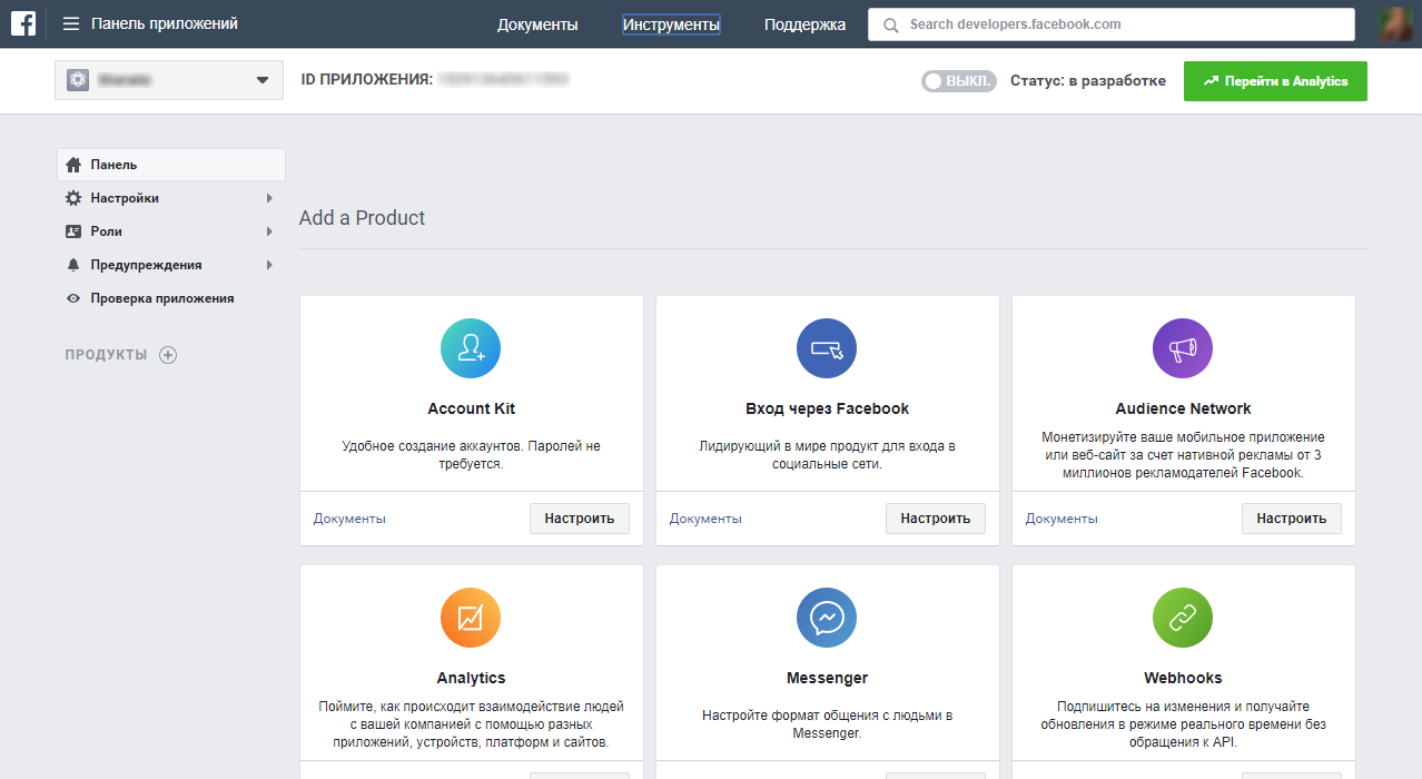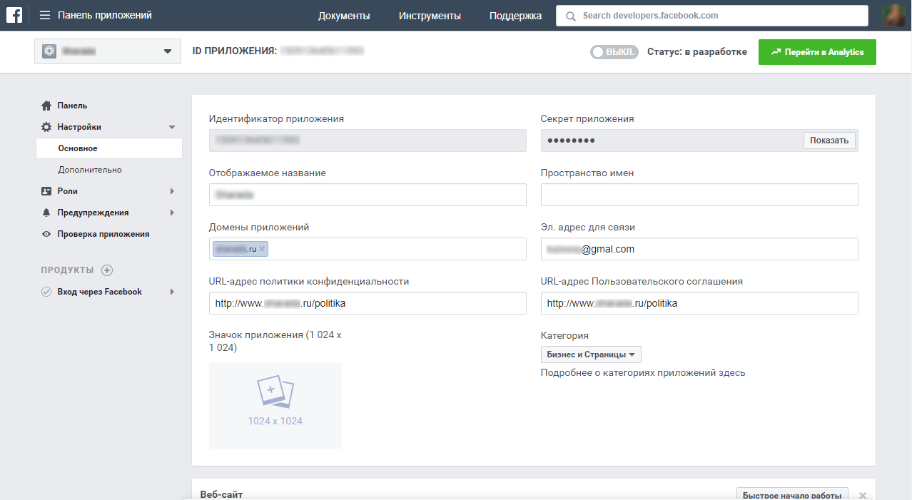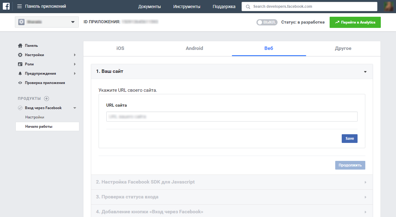 Выберите «Add a Product : Вход через Facebook : Настроить». Выберите платформу «Веб». В открывшейся странице:
