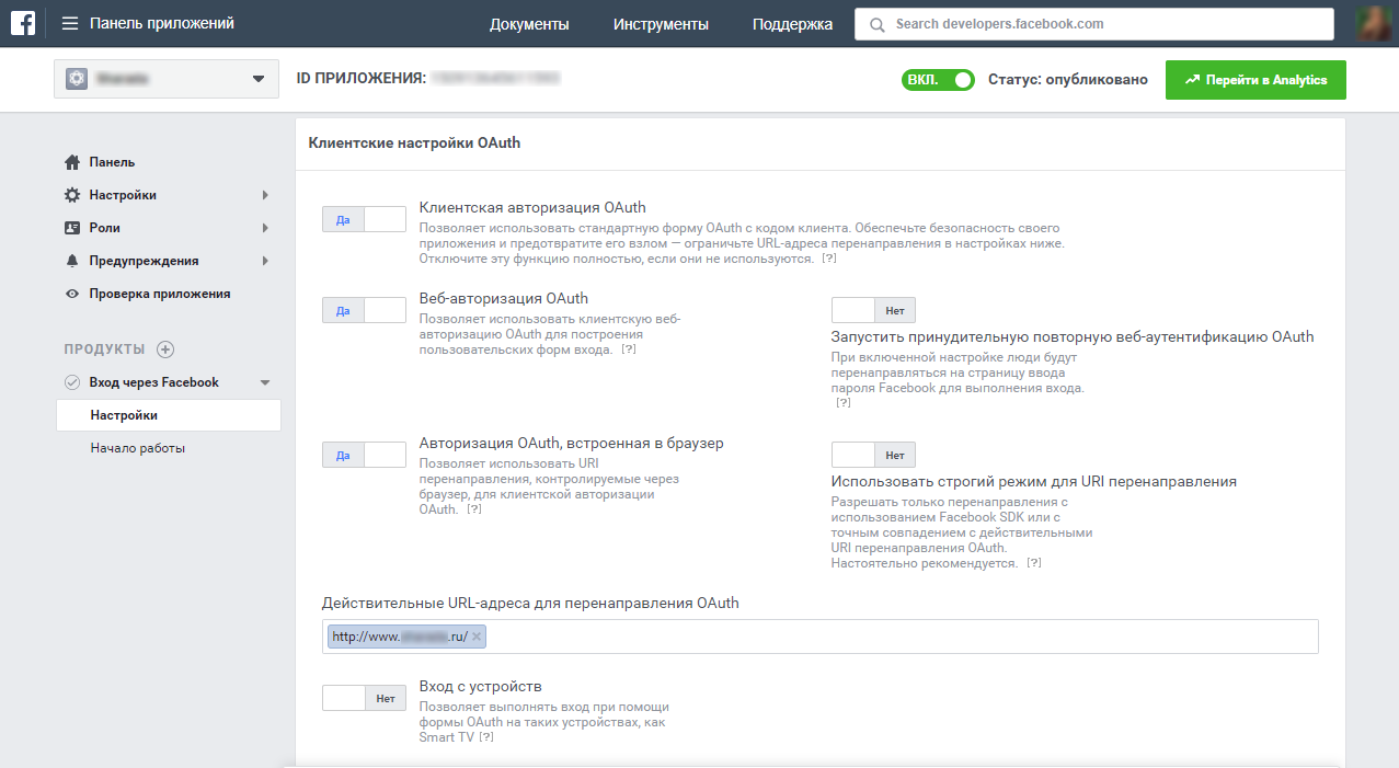 Перейдите в меню «Вход через Facebook : Настройки : Клиентские настройки OAuth».