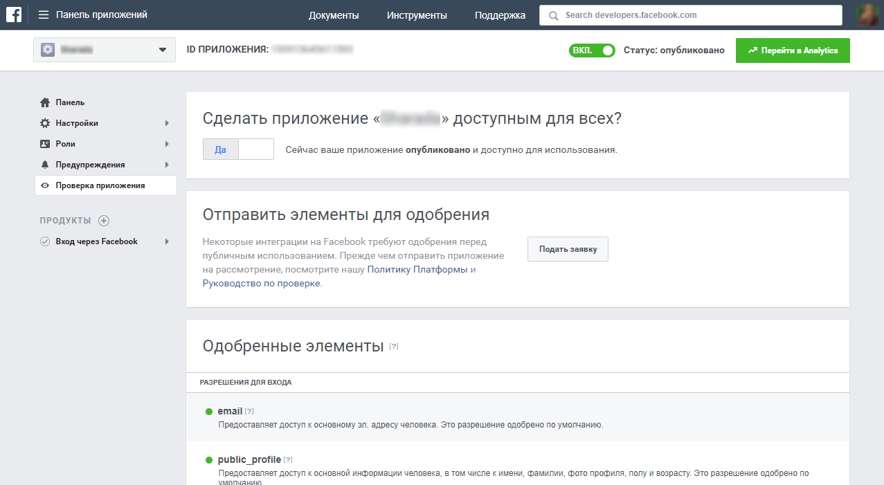 В верхнем меню переключите «Статус: в разработке» в «Статус: опубликовано». Перейдите в меню «Проверка приложения».