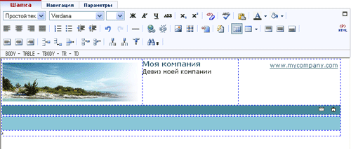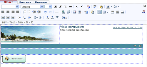 Пример: Для нашего графического макета, рассмотренного в предыдущих главах, выполним вставку специальных блоков главного меню и новостей. После верстки отдельных блоков, в блоке "Шапка" имеем следующий вид в Менеджере сайта.
