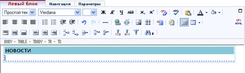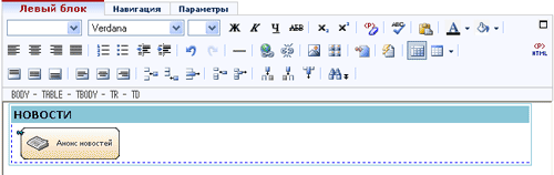 Рис. 17 В данном блоке будет специальный блок "Анонс новостей". Чтобы его вставить, встанем в ячейку курсором мыши и нажмем кнопку "Вставить/настроить специальный блок", в открывшемся окне выберем специальный блок "Анонс новостей". В результате получим следующее (см. рис. 18):
