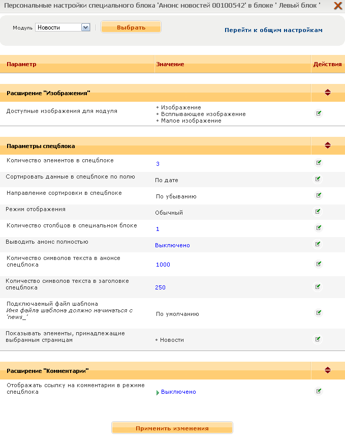 Рис. 18. Чтобы изменить параметры работы спецблока, такие как - количество отображаемых элементов, имя файла шаблона, и т.п. необходимо нажать на спецблок, а затем нажать кнопку "Вставить/настроить специальный блок" в панели визуального редактора. Пример: Окно настроек специального блока "Анонс новостей" выглядит следующим образом (см. рис. 19):