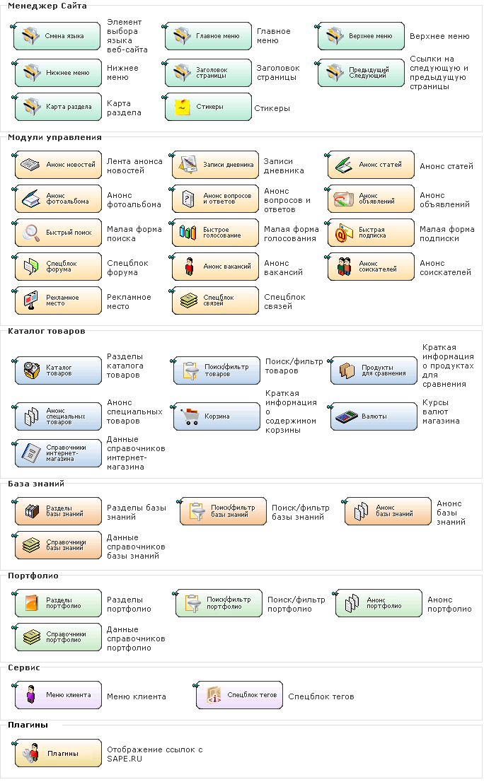 Рис. 14 Если название спецблока тусклое, это значит, что соответствующий модуль не установлен и спецблок не может быть вставлен на страницу. Назначение спецблоков
