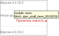 Для возможности удобной настройки сложных сайтов с множеством динамических блоков система Amiro.CMS предоставляет возможность работы в режиме отладки. В данном режиме могут подсвечиваться все включаемые блоки непосредственно на странице сайта, выводится информация о модуле – владельце специального блока, идентификационный номер конкретного блока. Пример: Подсвеченный спецблок анонса новостей с расшифровкой