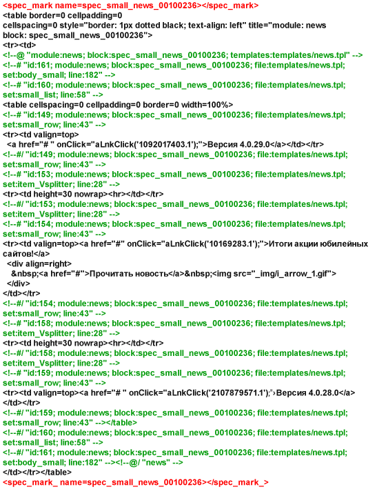 Рис. 30 Для разбора схемы формирования конкретного спецблока служит механизм отображения исходного кода спецблока с отладочной информацией о модуле владельце, всех использованных шаблонах, сетах, переменных и т.д., включая номера строк шаблонов. Пример: Исходный HTML код спецблока анонса новостей с отладочной информацией