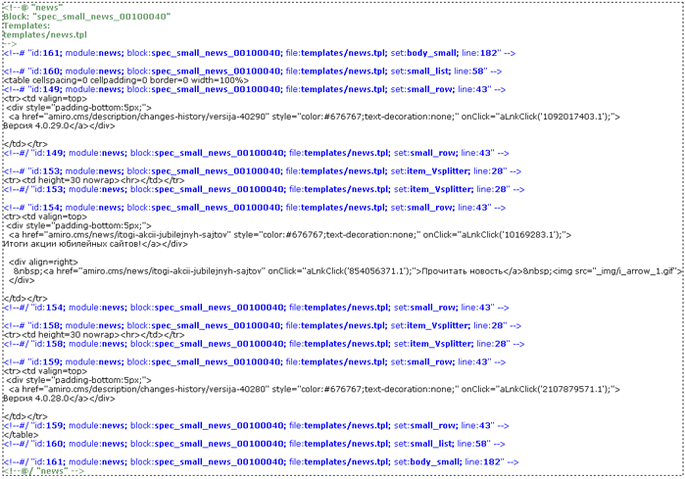 Рис. 32 При подсветке блока можно наблюдать ссылку на просмотр отладочного html кода блока: «html источник». Нажатие на данную ссылку приведет к открытию в новом окне страницы с полной html отладочной информацией о формировании данного блока. Фактически, это идентично запросу страницы с параметром _src=news и выводится для удобства работы и минимизации ручных наборов параметров к ссылкам. |