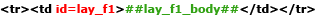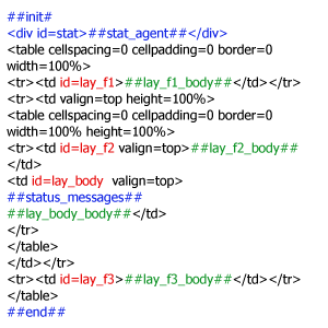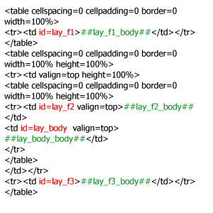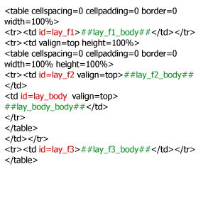 На вкладке «Макет» согласно разделению на блоки создается одна главная таблица или несколько таблиц идущих следом одна за другой. Последний вариант позволяет браузеру отображать страницу по частям по мере загрузки. Таким образом должен получиться каркас страницы с явно выделенными блоками, такими как, например: верхняя часть (шапка), левая часть (область меню или блока новостей) и т.д. Чтобы обеспечить полное управление содержанием блоков макета в Менеджере Сайта, макет не должен включать текст, картинки и т. д., т.е. макет должен быть чистым каркасом страницы. Ячейки таблиц (TD) соответствующие блокам верхняя часть (шапка), левая часть (область меню или новостей) и т. д. должны иметь атрибут id = lay_f1, lay_f2, lay_f3 и т. д. В ячейке, которая имеет данный атрибут, должна вызываться переменная соответствующая id этого блока. Пример: Допустим есть строка с одной ячейкой в которой будет один из блоков. Ячейке присвоили id=lay_f1, значит в ячейке должна быть вызвана переменная ##lay_f1_body##. Следовательно, строка будет выглядеть следующим образом: