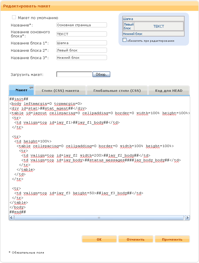 Следующим шагом будет создание макета страницы. Макет страницы – каркас, созданный средствами HTML без информационного наполнения, определяющий разбиение страницы на блоки (Шапка, Левая часть, Информационная часть и т.д.). Чтобы создать макет страницы необходимо в панели администратора открыть «Менеджер сайта - Макеты страниц». Поле редактирования макета представлено следующим образом (см. рис. 3).
