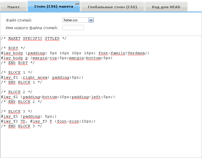 На форме редактирования макета рассмотрим закладку «Стили (CSS) макета».