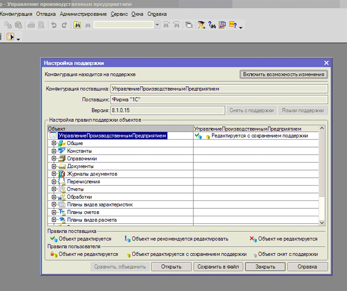 - Если Ваша конфигурация находится на поддержке и возможность изменения конфигурации выключена, то необходимо включить возможность изменения. Для этого выбираем пункт меню «Конфигурация» – «Поддержка» – «Настройка поддержки…» В появившемся окне (рис. 6) нажимаем кнопку «Включить возможность изменения».