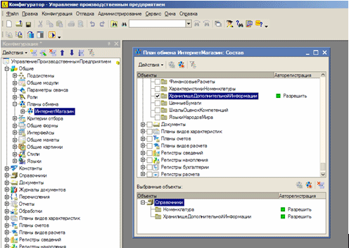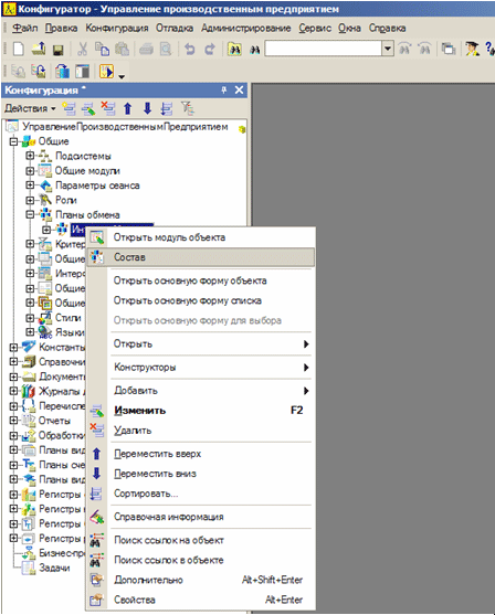 - Открываем окно конфигурации (Конфигурация – Окно конфигурации). В окне конфигурации выбираем ветку «Общие» – «Планы обмена». В планах обмена указываем мышкой на объект «ИнтернетМагазин» и, нажимая правую клавишу мышки, выбираем в появившемся контекстном меню пункт «Состав» (рис. 8).