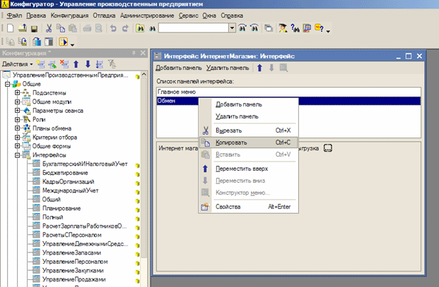 Выбираем в дереве конфигурации ветку «Общие» – «Интерфейсы» – «ИнтернетМагазин» и двойным щелчком мышки открываем окно интрефейса «ИнтернетМагазин». В окне интерфейса выбираем панель инструментов «Обмен» и копируем ее, щелкнув правой клавишей мышки и выбрав пункт меню «Копировать» (рис. 10).