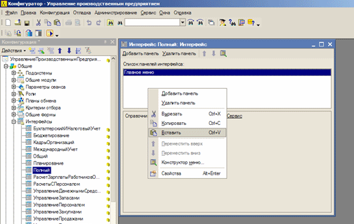 Затем вставляем скопированную панель инструментов во все необходимые интерфейсы. Например, предположим, что необходимо добавить панель инструментов для работы с экспортом в Каталог товаров в интерфейс «Полный». Для добавления выбираем в дереве конфигурации ветку «Общие» – «Интерфейсы» – «Полный», открываем двойным щелчком окно интерфейса «Полный» и нажав на списке панелей правой клавишей мышки выбираем в появившемся контекстном меню пункт «Вставить» (рис. 11).
