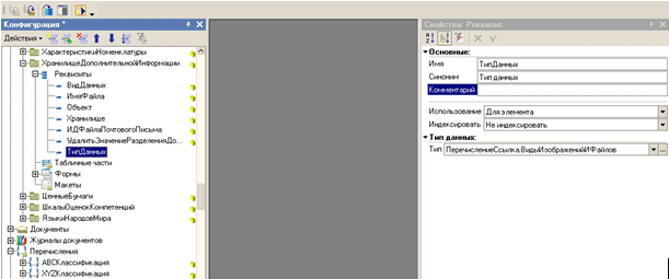 Если предполагается использовать несколько изображений либо дополнительные файлы (например, файл с инструкцией по эксплуатации) для одного элемента номенклатуры, то к справочнику «ХранилищеДополнительнойИнформации» необходимо добавить дополнительный реквизит. Для этого в конфигураторе находим справочник «ХранилищеДополнительнойИнформации», и нажимая правой кнопкой мыши, выбираем из контекстного меню пункт «Добавить» -> «Реквизит». Далее, в открывшемся окне свойств реквизита заполняем необходимые поля, например так, как показано на рисунке (рис. 12).