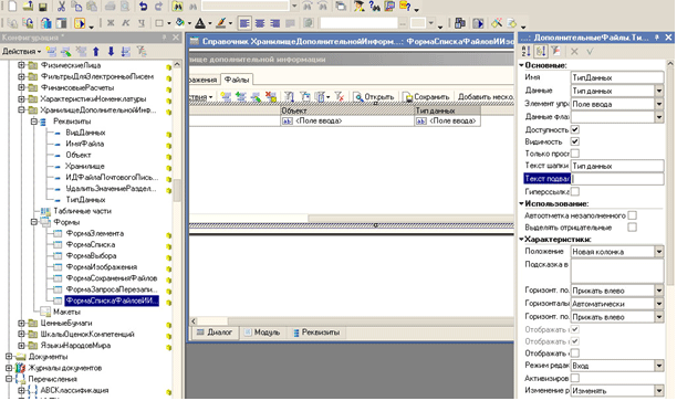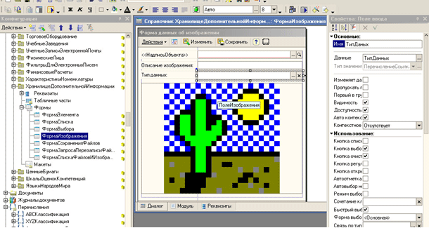 Текущая версия Каталога товаров позволяет задать до трех изображений (изображение, маленькое изображение, большое изображение), и не ограниченное число дополнительных файлов. В хранилище дополнительной информации, на форму ФормаИзображения («Форма данных об изображении») добавляем поле ввода «Тип данных», как показано на рис. 14.