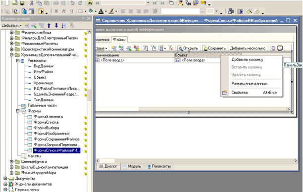 Далее, для удобства следует добавить колонку «Тип данных» на форму «ФормаСпискаФайловИИзображений». Для этого открываем макет формы, и переходим на вкладку «Файлы». Далее, нажатием правой кнопки мыши правее самой последней колонки, открываем контекстное меню и выбираем пункт «Добавить колонку» , как показано на рис. 15.