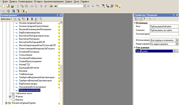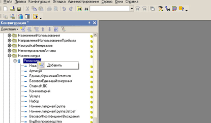 Если требуется публиковать на сайте не все товары или группы, тогда следует добавить соответствующий реквизит к справочнику «Номенклатура». Для этого в справочнике «Номенклатура» на элементе «Реквизиты» нажимаем правой кнопкой мыши и в появившемся меню выбираем пункт «Добавить» (Рис. 17).