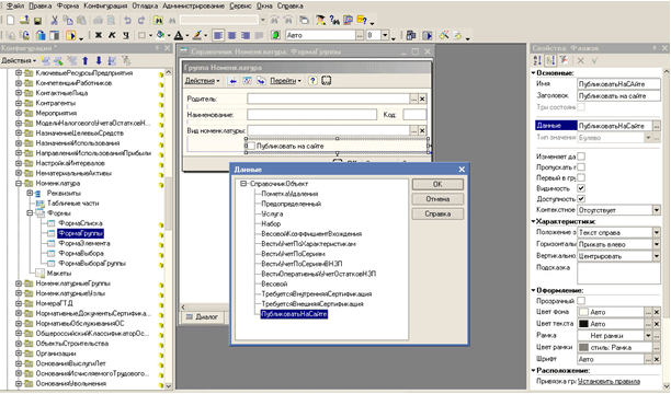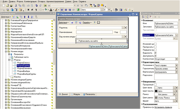 Далее добавляем элемент управления «Флажок» на форму добавления (изменения) группы номенклатуры. Для этого в справочнике открываем раздел «Формы», находим в нем форму «ФормаГруппы» и открываем ее на редактирование. Добавляем элемент управления «Флажок» и заполняем его свойства (Рис. 19).
