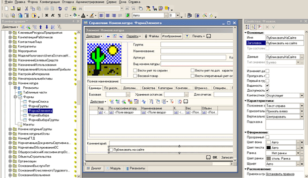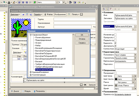 Аналогичным способом, добавляем элемент управления «Флажок» на форму добавления (изменения) номенклатуры. Для этого в справочнике в разделе «Формы», находим форму «ФормаЭлементы» и открываем ее на редактирование. Добавляем элемент управления «Флажок» и заполняем его свойства (Рис. 21).