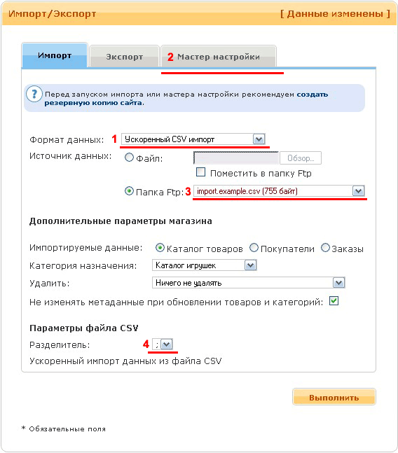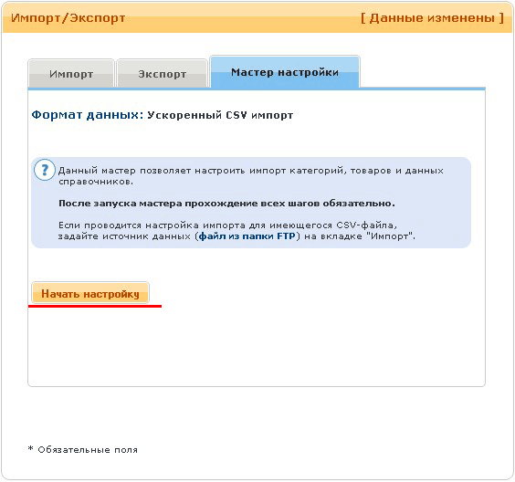 Мастер настройки предназначен для пошаговой настройки импорта из CSV-файла. Для запуска мастера откройте страницу обмена данными каталога товаров и задайте формат данных («Ускоренный CSV импорт» или «CSV импорт/экспорт» [Рис. 1 - 1]), после этого станет доступна вкладка «Мастер настройки» [Рис. 1 - 2]. Если в папке FTP присутствует CSV-файл, данные которого Вы собираетесь импортировать, то перед запуском мастера можно задать источником данных этот файл [Рис. 1 - 3]. После этого нужно перейти на вкладку мастера настройки и нажать кнопку «Начать настройку» [Рис. 2].