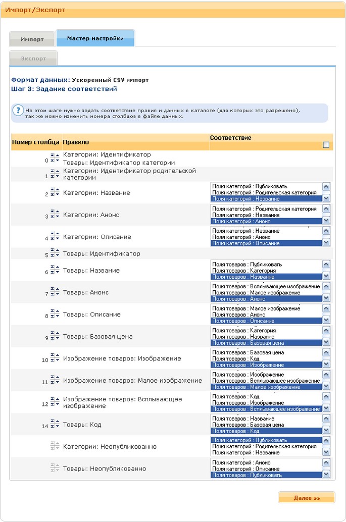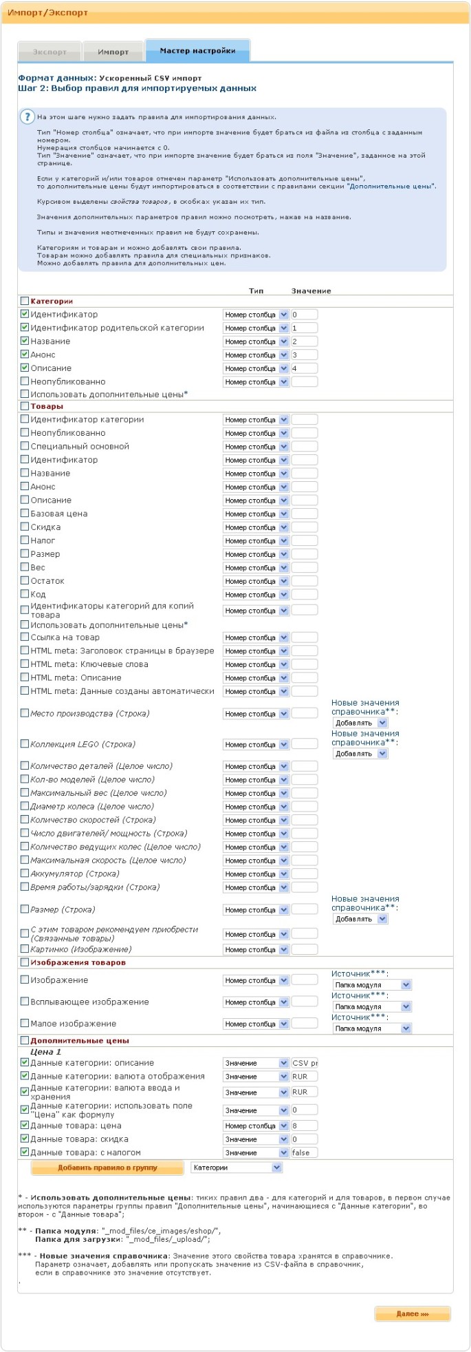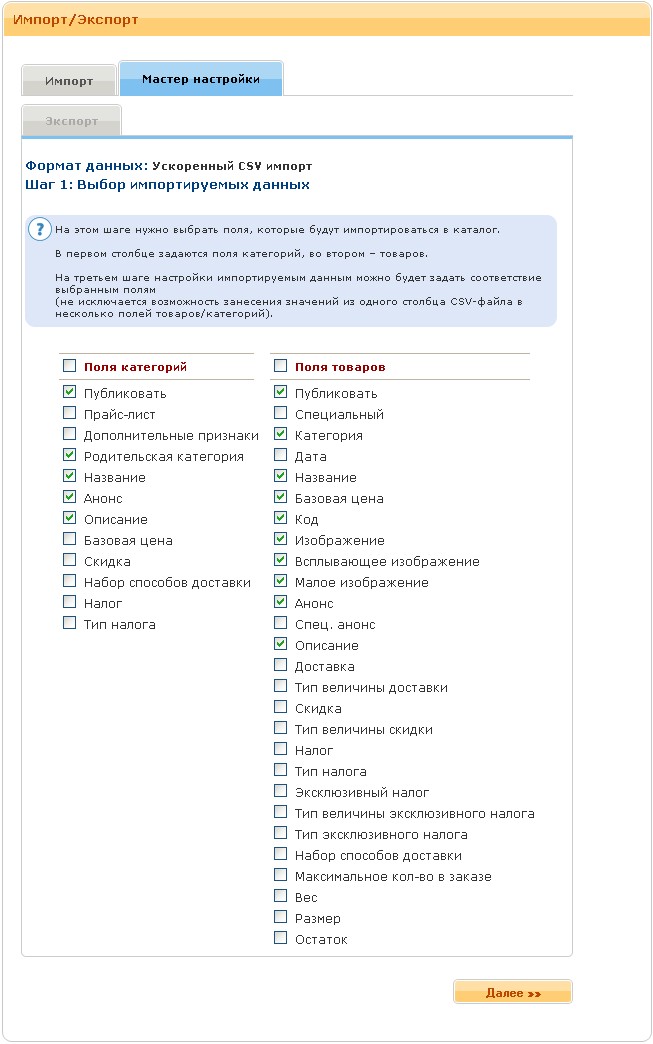Шаг первый: Выбор импортируемых данных На этом шаге нужно выбрать поля категорий и товаров (за исключением свойств товара и некоторых специальных полей), в которые будут импортироваться данные из CSV-файла. На третьем шаге настройки импортируемым данным можно будет задать соответствие выбранным полям (не исключается возможность занесения значений одного столбца CSV-файла в несколько полей товаров/категорий). В нашем случае мы будем импортировать следующие поля: а) Поля категорий: