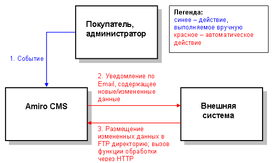 Любое действие по добавлению нового заказа или покупателя или их изменение через раздел администратора или публичную часть сайта генерирует событие, порождающее вызов функций обмена.