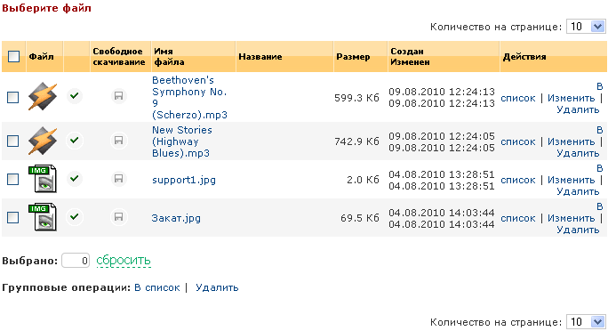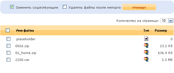 Модуль позволяет вести работу с цифровыми товарами каталога. При выборе данного типа товара, на форме появляется дополнительное поле “Файл”, иконка открытия popup-окна для добавления/удаления файлов, и количество файлов у товара. К каждому товару может быть прикреплено неограниченное количество файлов. Один и тот же файл нельзя назначить нескольким товарам одновременно. Также модуль позволяет делать импортирование файлов, которые были предварительно закачаны через ftp. По умолчанию ftp директория системы установлена в /_mod_files/_upload относительно корня файловой системы сайта. Список элементов для импортированияНепосредственно над списком элементов расположены управляющие элементы (Смотри Рисунок 10):