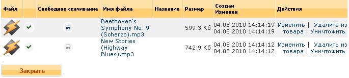 Необходимо обратить внимание, что при редактировании товара и вызове popup-окна редактирования списка файлов, все проводимые действия над списком непременно применяются к товару, и не могут быть отменены. |