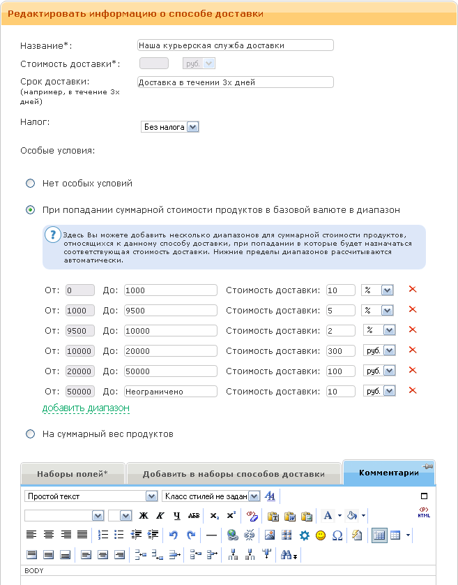 - Комментарии. Комментарии выводятся пользователю при оформлении заказа под названием способа доставки.