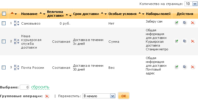 - Особые условия. Особые условия, заданные при создании или редактировании способа доставки. Возможные значения «Нет», «Сумма», «Вес».