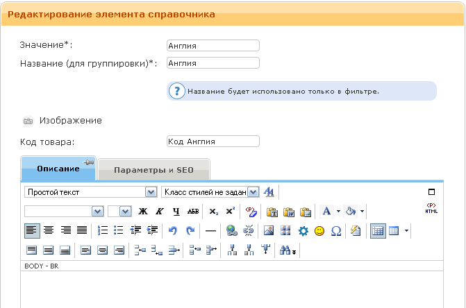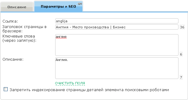 - Описание. Располагается на закладке «Параметры и SEO». Данное поле будет выведено в мета тэг «description».