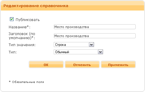 - Тип значения. Может быть "Строка", "Целое число", "Дробное число", "Дата", "Набор флагов", "Связанные товары", "Связанные категории".