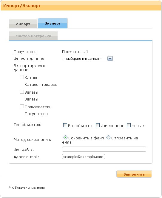 Рисунок 22 ЭкспортНа вкладке «Экспорт» можно выполнить экспорт данных каталога товаров в файл обмена для другого приложения. Необходимо указать получателя. Получатели – это приложения, для которых формируется файл обмена. Наличие получателя позволяет системе регистрировать какие данные уже были выгружены для данного получателя, чтобы не дублировать информацию при регулярных выгрузках. Список получателей указывается в настройках Каталога Товаров. Далее, необходимо указать формат файла обмена. Форматы данных доступные для того или иного получателя, так же задаются в настройках каталога. Можно выгрузить данные каталога или заказы за определенную дату, все, новые или измененные. Метод сохранения указывает сохранить файл или отправить по e-mail. (Смотри Рисунок 23)
