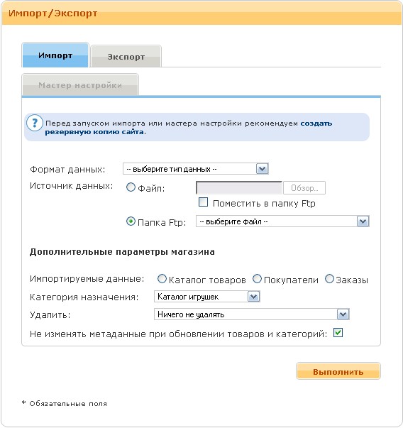 Модуль «Обмен данными» позволяет выполнять импорт и экспорт данных каталога товаров в различных форматах. ИмпортНа вкладке «Импорт» можно выполнить импорт каталога товаров из файла обмена сформированного другим приложением. Необходимо указать тип данных, файл с данными в указанном формате на компьютере или на сервере, категорию назначения, выбрать способ предварительного удаления данных, способ обновления метаданных. (Смотри Рисунок 22)