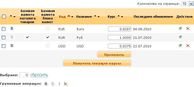 - Курс. Текстовое поле ввода – курс валюты, по отношению к базовой валюте каталога. После изменения курсов валют, чтобы изменения вступили в силу, необходимо нажать кнопку “Применить”, которая расположена в последней строке списка.