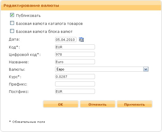 - Публиковать. Если флажок установлен, то валюта будет опубликована на сайте в специальном блоке валют.