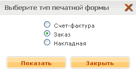 Печатную версию заказа можно получить двумя способами: используя иконку “Напечатать”, или воспользовавшись кнопкой “Версия для печати” на форме редактирования заказа. В зависимости от конфигурации, вам будет предложено выбрать одну из нескольких печатных форм (см. Рисунок 27), после выбора которой, откроется новое окно с соответствующей печатной формой.