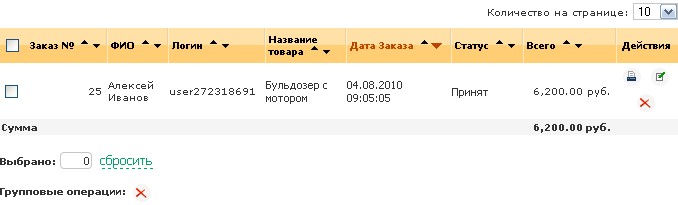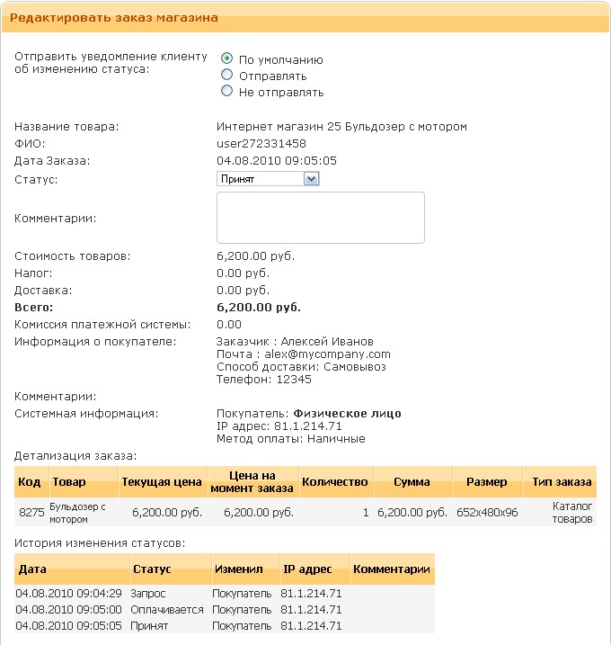 Модуль “Заказы” предназначен для просмотра и управления поступившими заказами. Название, цена товара, имя пользователя, и многие другие параметры сохраняются вместе с заказом в том виде, в котором они были на момент поступления заказа. Вы можете изменять, удалять товары, производить какие-либо другие действия, информация в заказе не изменится.