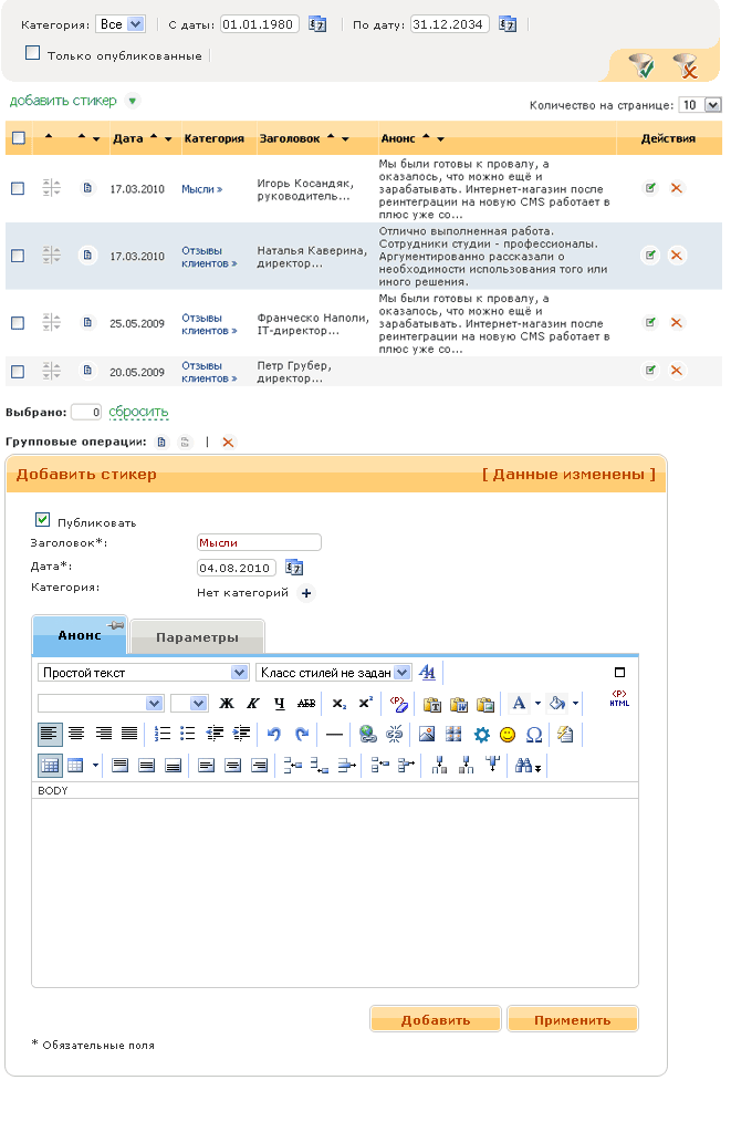 Модуль «Стикеры» предназначен для опубликования статических блоков информации. Стикеры выводятся в виде списка заголовков, при нажатии на заголовке – появляется полностью его анонс. Модуль «Стикеры» состоит из двух разделов: категории статей и непосредственно статьи.
