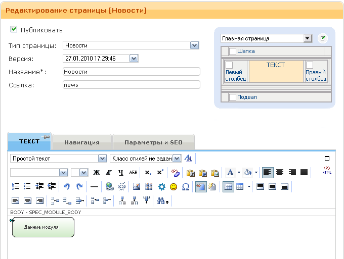 Форма редактирования страницы Рисунок 4 ШаблонШаблон позволяет указывать, какой файл-шаблон модуля должен быть использован на этой странице. Другими словами, это возможность оформлять многостраничные модули по-разному на разных страницах. К примеру, на странице документация список файлов может быть оформлен в одну колонку и без картинок, а в прайс-листах – можно вывести файлы с описаниями, картинками, в несколько колонок и отсортированными по категориям. Чтобы файл-шаблон появился в этом выпадающем списке, необходимо создать копию шаблона с постфиксом [_anyname]. Например для модуля Новости основной шаблон называется news.tpl, чтобы копия шаблона появилась в выпадающем списке, нужно назвать её news_anyname.tpl