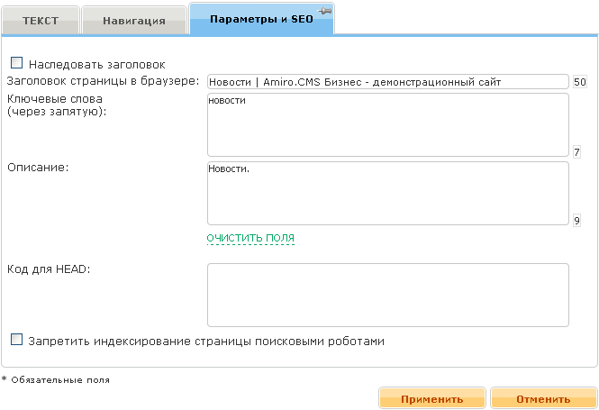 Amiro.CMS позволяет задавать заголовок страницы в браузере, описание страницы и ключевые слова. На вкладке «Параметры» вы можете задать заголовок страницы. Вы можете включить наследование заголовка родительской страницы, это значит, что текст заголовка этой страницы будет прибавлен к тексту заголовка родительской страницы. Автоматически заголовок генерируется по шаблону, заданному в разделе «Настройка системы» - «Менеджер сайта» - «Менеджер сайта» параметр «Шаблон автогенерации заголовков»: ##object_name## | ##site_title##, где ##object_name## - название страницы, ##site_title## - заголовок сайта по умолчанию. А так же здесь вы можете ввести описание страницы и ключевые слова, эта информация используется поисковыми серверами для индексации сайта. Форма ввода ключевых слов