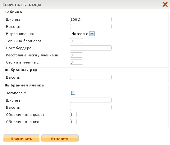 С Amiro.CMS Вы можете создавать таблицы любой сложности. Чтобы создать таблицу поместите курсор в место, где вы хотите создать таблицу, и нажмите кнопку Чтобы изменить параметры таблицы, ряда или ячейки выделите таблицу, ряд или ячейку и нажмите кнопку Если была выбрана таблица, заголовки свойств ряда и ячейки будут написаны во множественном числе, и параметры будут применимы ко всем рядам и ячейкам таблицы. Если был выбран ряд, заголовок свойства ряда будет написан в единственном числе, и свойства ряда будут применимы к текущему ряду; заголовок свойств ячеек будет написан во множественном числе, и свойства будут применимы ко всем ячейкам выбранного ряда. Если курсор стоял в ячейке или был выделен фрагмент текста ячейки, заголовки ряда и ячейки будут написаны в единственном числе и свойства ряда будут применимы к текущему ряду и свойства ячейки будут применимы к текущей ячейке. Диалог установки свойств таблицы Рисунок 20 Чтобы задать цвет фона таблице или ячейке, выделите таблицу или поместите курсор в нужную ячейку, нажмите кнопку Чтобы установить фоновую картинку для таблицы выделите требуемый объект (таблицу или ячейку) и нажмите кнопку |