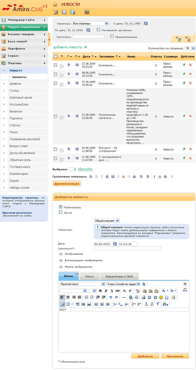 Все модули управления состоят из панели общей информации о модуле, панели фильтра, строки статуса, списка элементов и формы редактирования.