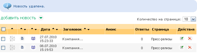 Строка статусаСтрока статуса предназначена для вывода результата последнего совершенного действия и описание ошибки, если она произошла во время действия. Последний измененный или добавленный элемент в списке выделяется цветом. Пример статусного сообщения Рисунок 4 Список элементовСписок элементов предназначен для отображения элементов, попавших в фильтр и вызова действий, доступных для элемента (например, редактирование, удаление и т.п.). Пример списка элементов Рисунок 5 Список элементов включает: