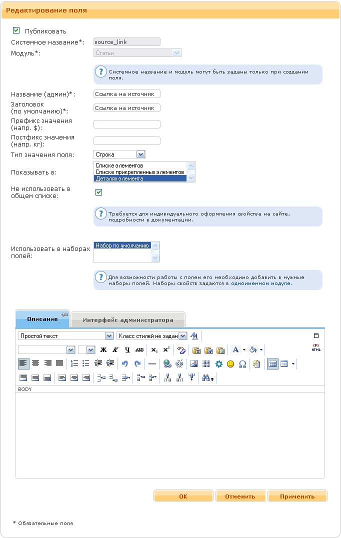 - Статус элемента. Если флажок помечен, то поле будет отображаться на сайте.