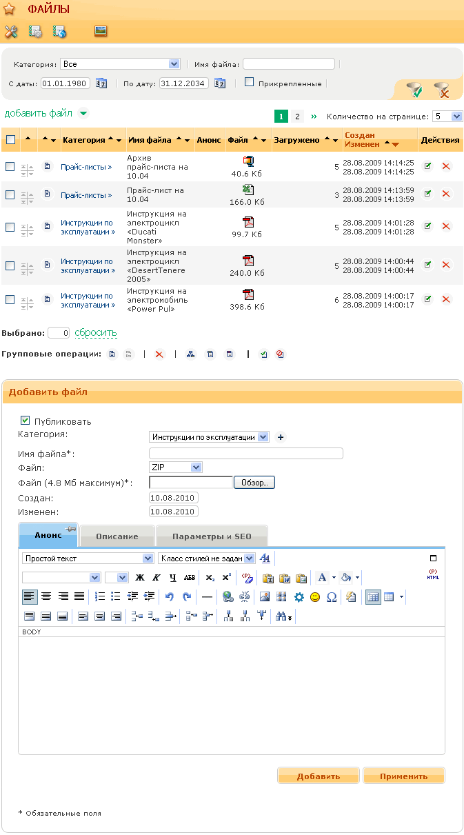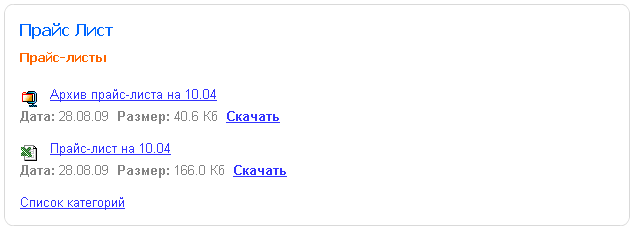 Модуль «Файловый архив» позволяет администратору закачивать на сайт файлы различных форматов, распределять их по категориям и публиковать на сайте ссылки на них. Для каждого файла есть возможность отображать его текстовое описание, размер, количество загрузок и рейтинг. Ссылка на загруженный файл может быть помещена в любом разделе сайта.