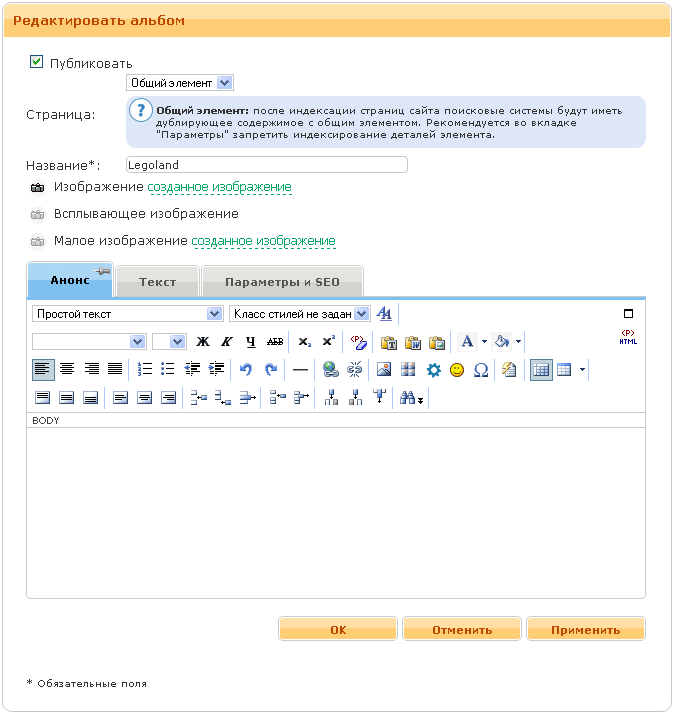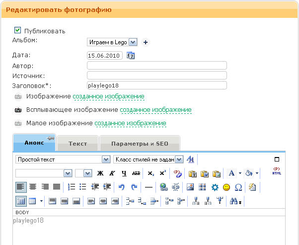 - Анонс. Краткий анонс для фотографии, отображается в списке фотографий. Ввод текста осуществляется с помощью визуального редактора.