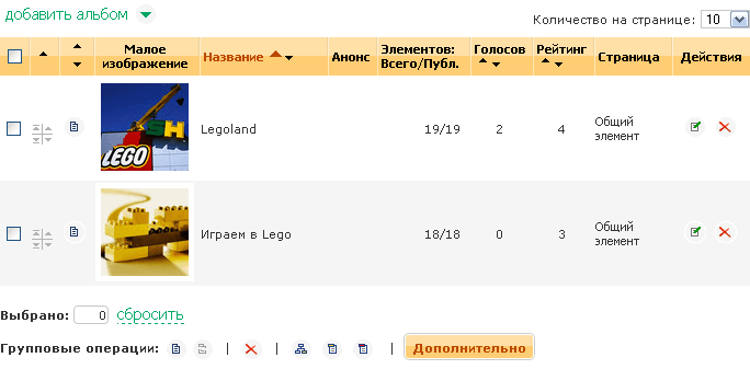 - Создать альбом. Вы можете ввести в это поле название нового альбома для его создания. В многостраничной конфигурации можно указать на какой странице публиковать создаваемый альбом.